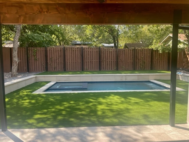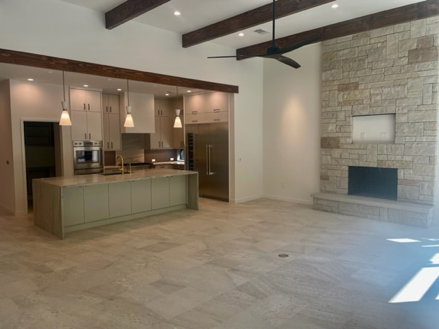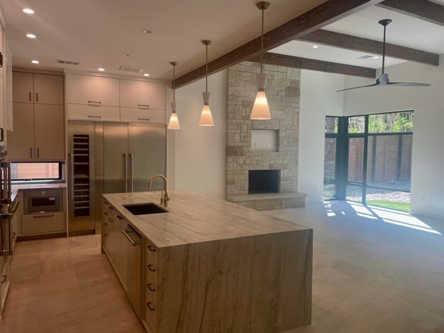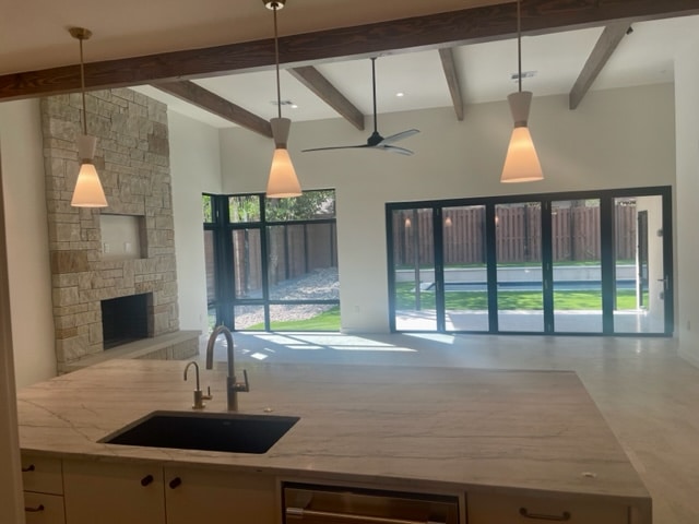 The open kitchen/living/dining features high ceilings with Doug Fir Wood Beams, an all-masonry Lueder Stone fireplace, floor-mounted western window corner, a large folding La Cantina glass door leading out to a spacious covered porch and large heated swimming pool/spa with connecting artificial turf.