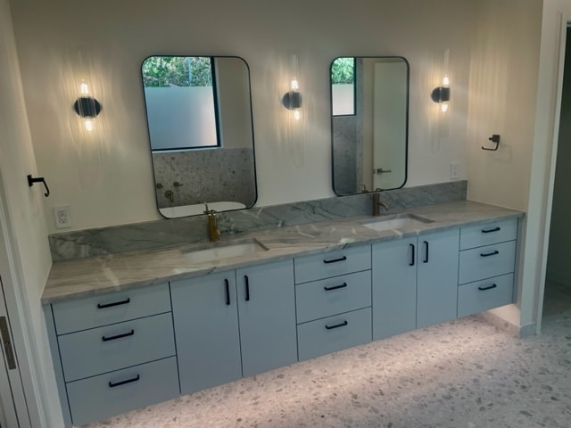 The kitchen island features Quartzite countertops, a large Kohler stainless steel sink, satin brass faucets, with separate filtered water, quiet dishwasher and pull out trash drawer. Thermador appliances include built in refrigerator/freezer/wine frig columns, double side hinged ovens, professional gas cooktop, enclosed hood liner with venetian plaster surround and a microwave drawer. Cabinets are euro-style with soft close doors and drawers. A walk-in pantry is included for extra storage space. There is brushed natural stone large format flooring throughout first floor. Laundry includes a sink and bench cubby centrally located to the two-car epoxy floor garage that has a vertical Doug Fir stained overhead door with quiet side mount Liftmaster opener.