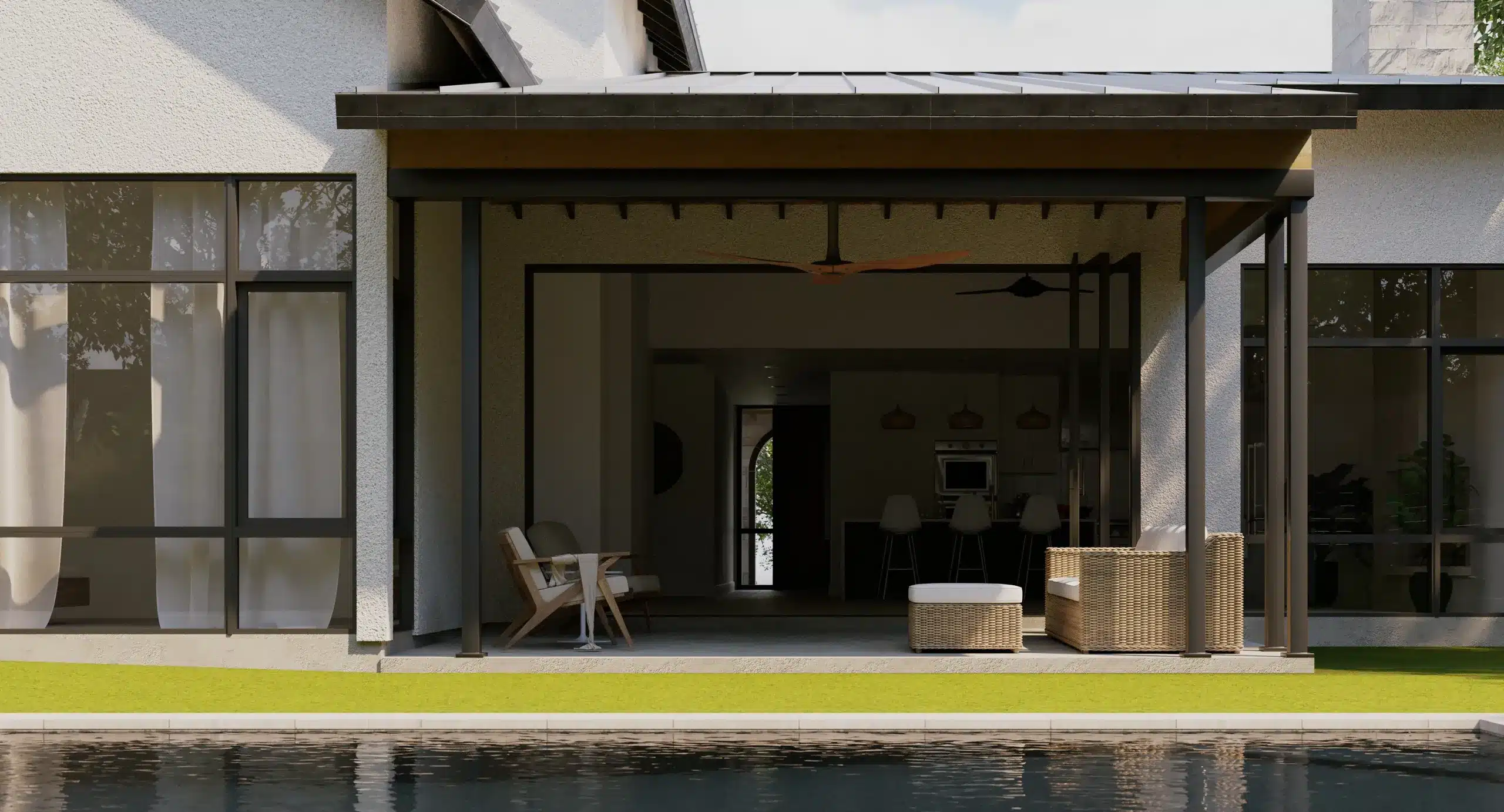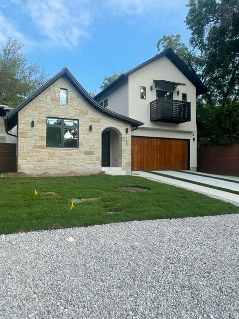 Exterior consists of Lueder modern format stone, smooth stucco walls and standing seam metal roof exteriors.